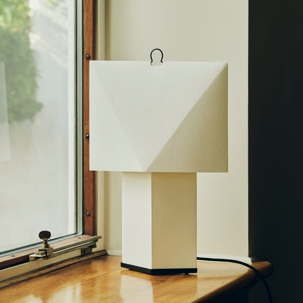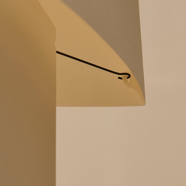 Den særlige papirflade på lampen er nøje designet til at diffundere lyset og skabe en varm, indbydende atmosfære, der minder om skæret fra et stearinlys. Det minimalistiske design er suppleret med en diskret metalkrog, hvilket gør det let at omplacere lampen efter behov.