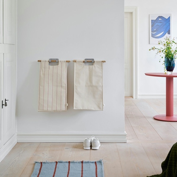 Systemet består af en slank metalkrog, der let monteres på væggen, og to egetræspinde, som holder den aftagelige tekstilpose sikkert på plads. Kombinationen af metal, træ og tekstil skaber et elegant, minimalistisk udtryk, der smelter naturligt ind i moderne hjem – uanset om den hænger i entré, badeværelse, bryggers eller børneværelse.
