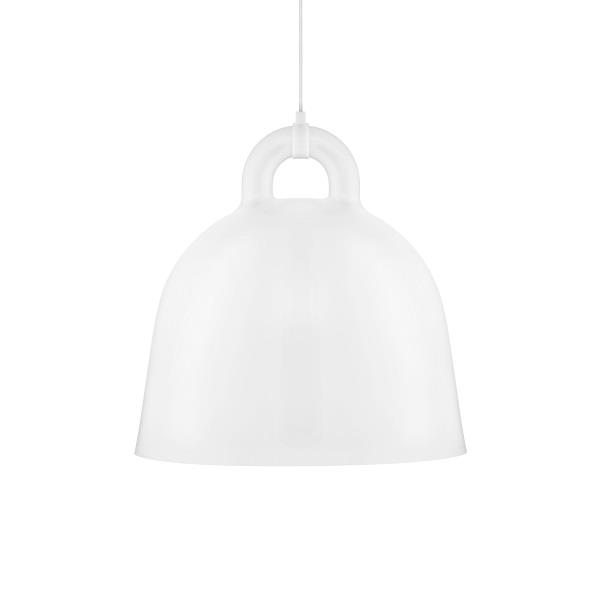Bell loftlampe fra Normann Copenhagen, udtrykker robust-hed og en enkel form. Bell er en loftslampe i en ikonisk klokkeform og med et industrielt designudtryk, der gør pendlen lampen idéel til alle hjemmets rum. Den runde silhuet og matte overflade giver indtrykket af, at lampen er støbt. Kontrasten mellem materialerne skaber en moderne lampe. Bell lampen har lys inderside der reflekterer lyset,. Lyset falder som en kegle og giver en god lyskilde eksempelvis over spisebordet. Bell lampen i hvid har matchende stofledning og baldakin.