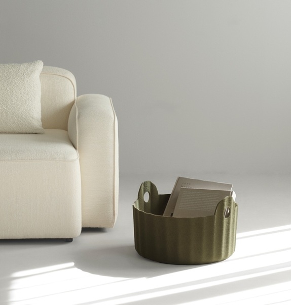 Colu kurven er fremstillet af genbrugt PET-filt, et holdbart og blødt materiale, som er produceret af genanvendte plastikflasker. Dette gør hver kurv til et bæredygtigt valg for miljøbevidste forbrugere. Kurvens design er inspireret af den klassiske arkitektur fra de romerske søjler, hvilket tilfører en tidløs elegance til dens udtryk. De rytmiske gentagelser af udhulede buer er ikke blot dekorative, men fungerer også som integrerede håndtag, hvilket gør kurven let at flytte rundt på.