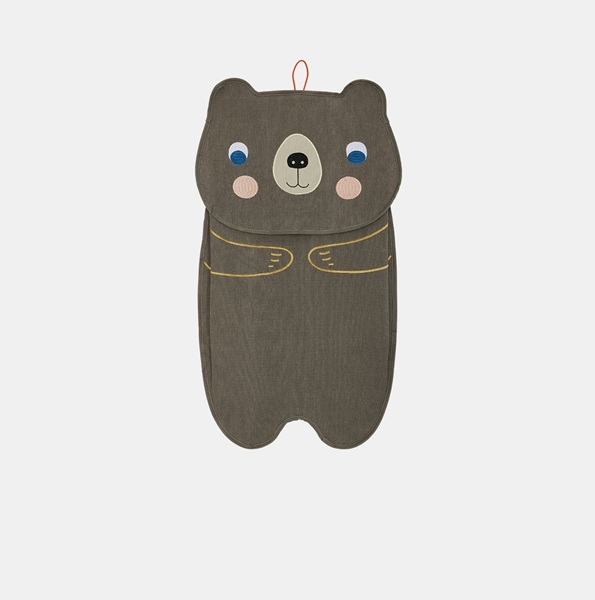 Forsiden har et sødt broderet bjørneansigt, og en nylonløkke gør den nem at hænge på væggen.