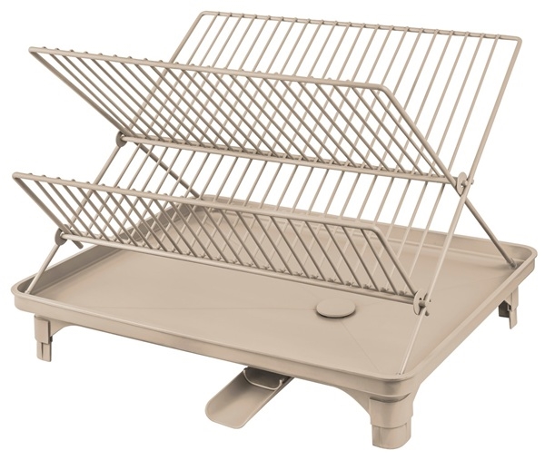 Stativet er designet med en todelte konstruktion, der effektivt rummer alt fra tallerkener og glas til bestik. Den robuste plastikbakke nedenfor fanger overskydende vand, hvilket sikrer, at din bordplade forbliver tør og pæn. En smart feature er den udtrækkelige tud, som automatisk leder vandet ned i vasken, og forenkler din køkkenrutine uden vandsjaskeri på overflader.