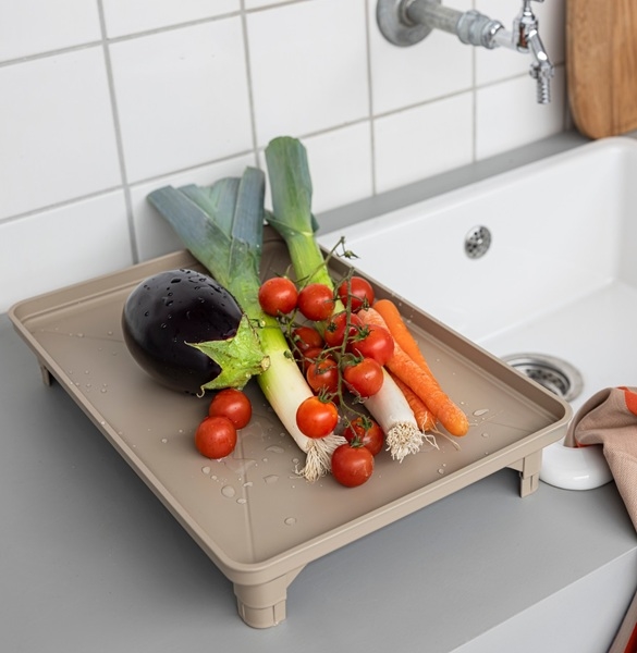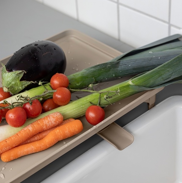 Yderligere funktionalitet tilbydes i form af plastikbakken, der også kan anvendes separat til at skylle frugt og grøntsager under vandhanen, med dens integrerede tud der effektivt leder vandet væk.