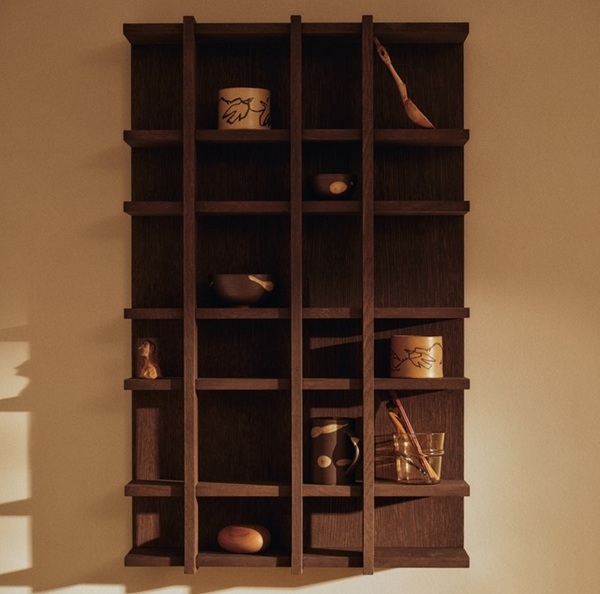 En særlig detalje ved hylden er det diskrete mellemrum mellem de vertikale skillevægge og bagpanelet. Denne gennemtænkte løsning lader lyset passere igennem og skaber et let og luftigt udtryk, selv i den mørkere træfinish. Samtidig giver det plads til håndtag på kopper eller tekander, hvilket gør hylden både praktisk og visuelt interessant.