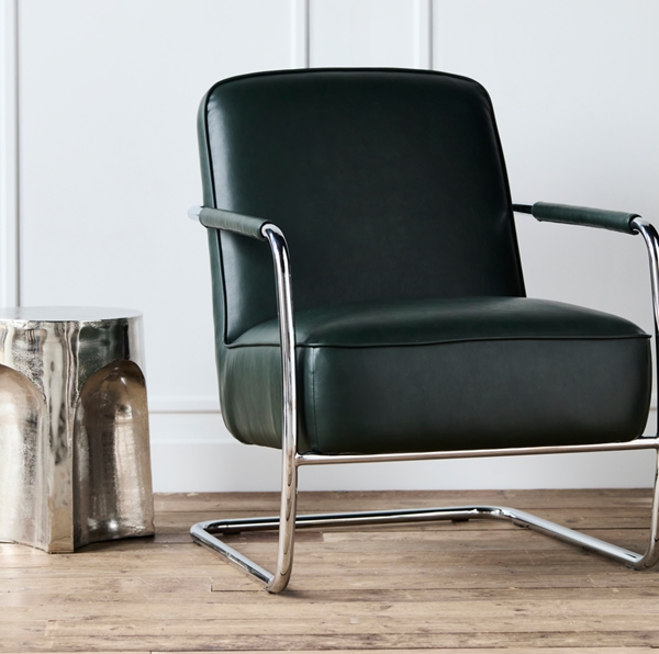 Skab et rum, der inviterer til ro og komfort, med den elegante loungestol i mørkegrøn – et møbel, hvor moderne design og afslappet luksus går hånd i hånd.