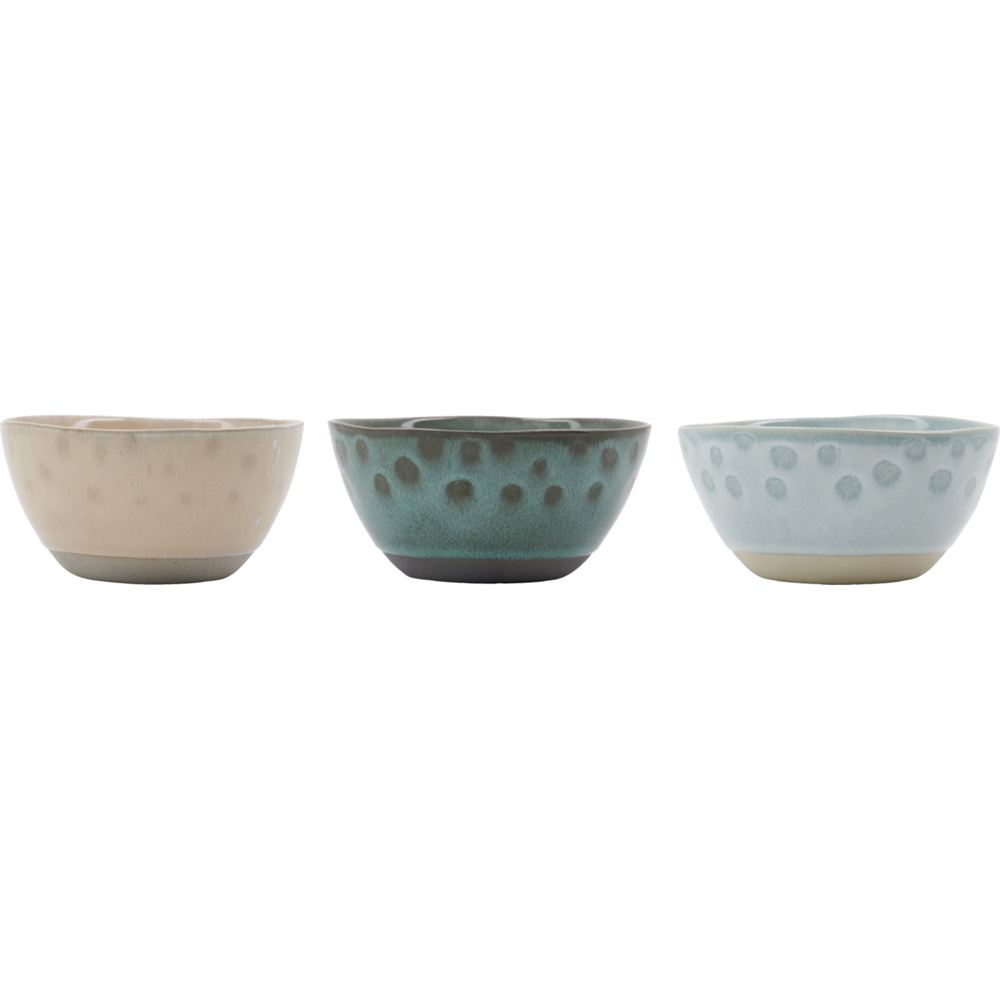 Hvert sæt består af tre skåle i beroligende farver: en dyb beige, en frisk grøn og en beroligende blå. Den slebne bund og de håndlavede prikdetaljer på hver skål sikrer en unik præsentation, der er sikker på at imponere dine gæster. Med dimensioner på højde: 6 cm og diameter: 12 cm, er disse skåle ideelle til en række forskellige serveringsmuligheder.