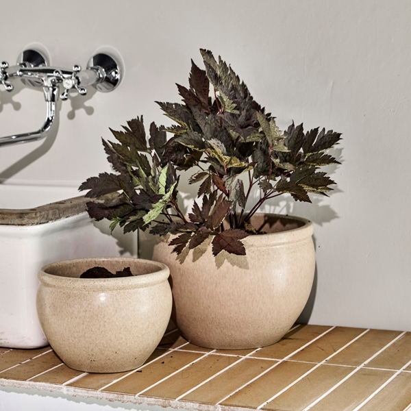 Hver krukke er håndlavet, hvilket betyder, at de har små unikke variationer i form og glasur, som tilføjer karakter og personlighed til dit hjem. Den beige glasur reflekterer lys smukt og skaber en varm, neutral base, der fremhæver plantens naturlige farver. Resultatet er en harmonisk og stilfuld kombination af materialer og design, der passer perfekt ind i et nordisk hjem.