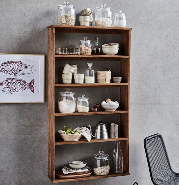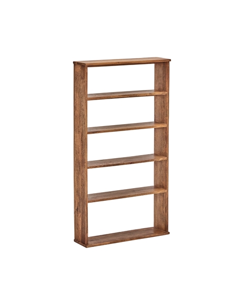 Reolens fem faste hylder giver rigelig plads til at organisere tallerkener, glas, kurve, bøger eller dekorative genstande. Du kan bruge reolen som en funktionel opbevaringsløsning i køkkenet, hvor den holder køkkenting inden for rækkevidde, eller som et smukt display i stuen, hvor den fremhæver dekorative elementer og samtidig skaber orden.