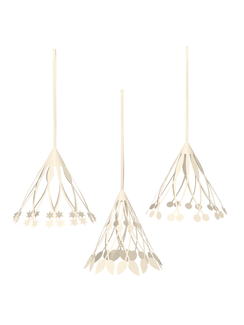 Ornamenterne egner sig perfekt til at hænge på juletræet, på en dekorativ gren, i vinduespartier eller som del af en smuk juleopdækning. Den off-white farve giver et roligt og afdæmpet udtryk, der let kan kombineres med andre farver og teksturer – hvad enten du går efter et klassisk look med rødt og grønt eller en mere minimalistisk jul med naturmaterialer og afdæmpede nuancer.