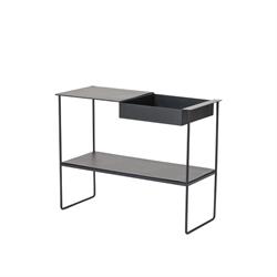 Flot og stilfuld konsolbord der nemt kan fungere som et multifunktionelle møbel. Brug det som barbord i stuen eller til opbevaring i køkken til madlavning ingredienser og andre ting. Det minimalistiske og stilfulde design gør, at det passer fint i den nordiske indretning. Stellet, hylderne og opbevaringskassen er lavet af sort pulverlakeret stål. Hylder og bordplade er dækket med sort genanvendt læder.
