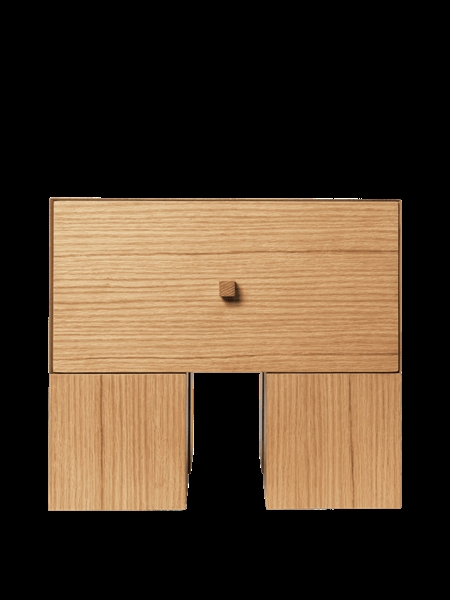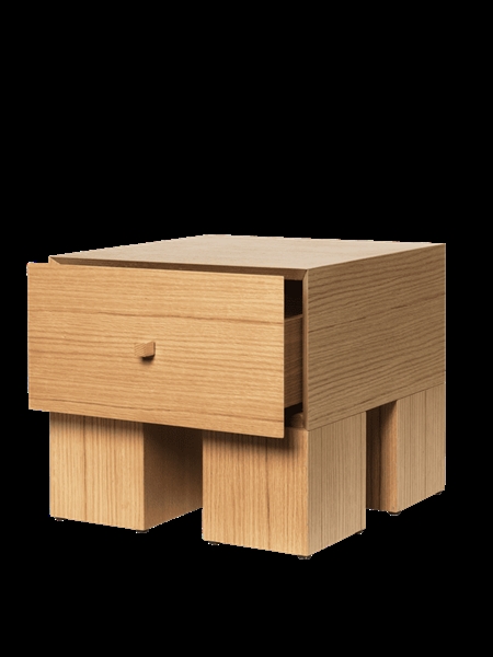 Det rene, kubiske formsprog og de præcise linjer giver sengebordet et moderne og skulpturelt udtryk. Kombinationen af skarpe kanter, skråt skårne samlinger og overdimensionerede kubeformede fødder skaber en visuel balance mellem lethed og tyngde – en sjælden detalje, der gør Kuben både markant og harmonisk i sit udtryk.