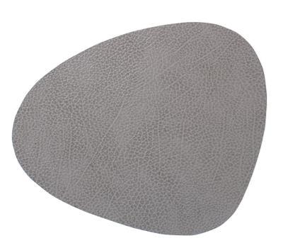 Antracit-grå Hippo dækkeserviet i genbrugslæder fra lind DNA. Dækkeservietten er i curve form, hvilket er designet så der er plads til et glas, men samtidigt også designet, så de fylder mindst muligt på bordet