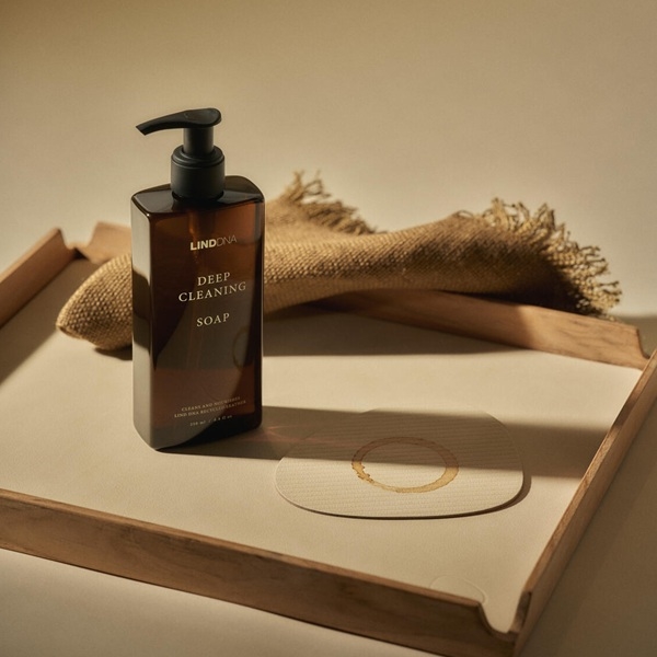 Med en kapacitet på 250 ml, tilbyder LIND DNA Deep Cleaning Soap en kraftfuld rensende virkning, samtidig med at den er skånsom mod det genbrugte læder. Sæbens formel indeholder mindre end 5% ikke-ioniske overfladeaktive stoffer, som effektivt fjerner snavs uden at skade læderets naturlige struktur. Derudover er sæben beriget med konserveringsmidler og en subtil parfume, der efterlader en behagelig og beroligende duft af amber.