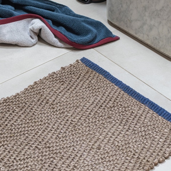 Håndvævet Jute Tæppe – Latte med koboltblå kant (50x80 cm)