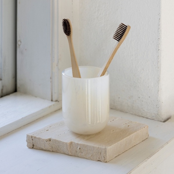 Opdag den stilfulde 'Opal tandbørsteholder i linin fra Mette Ditmer', der vil tilføre dit badeværelse en følelse af ro og harmoni. Denne unikke tandbørsteholder er fremstillet i opalglas, kendt for sin bløde transparens og subtile dybde, der spreder lyset på en blid og indbydende måde. Med sin levende, næsten flydende karakter, ændrer tandbørsteholderens udseende sig alt efter lysets spil, hvilket tilfører en dynamisk og elegant atmosfære.
