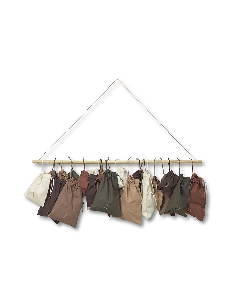 Pakkekalender - med 24 pakkeposer i brune nuancer fra Ferm Living. Gør dig klar til årets mest fortryllende tid med denne moderne pakkejulekalender fra Ferm Living! Denne julekalender giver dig mulighed for at tælle ned til jul ved at give en lille gave hver dag i december frem til juleaften. Christmas Countdown fra Ferm Living er en fantastisk måde at sprede glæde og forventning på. Den består af 24 pakkeposer lavet af 100 % GOTS-certificeret bomuld i smukke brune nuancer. Hver enkelt pose har et broderet gyldent tal, der angiver datoen. Dette gør det endnu mere spændende at åbne en ny pose hver dag! Pakkeposerne hænger elegant fra en FSC™-certificeret træstang, som er fastgjort med stilfulde lædersnore.