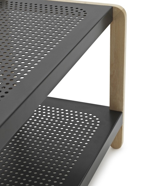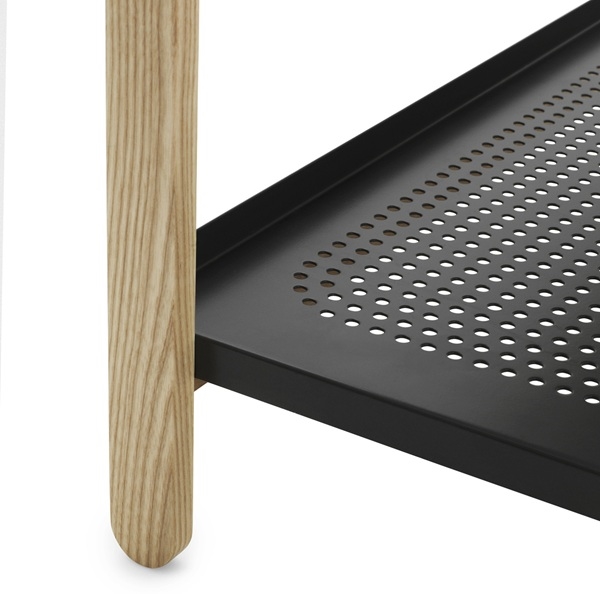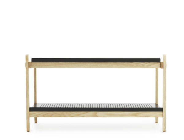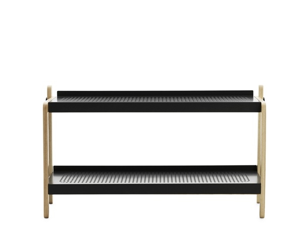 Designet er bevidst enkelt – uden unødvendige detaljer. Hver komponent har en funktion, og intet er overflødigt. Den solide træramme i ask giver naturlig varme og struktur, mens de to stålhylder tilføjer en moderne kontrast. Hylderne er perforerede, så skoene kan ånde, og så støv og snavs ikke samler sig. De fremhævede skruer og bolte er en integreret del af designet og understreger det industrielle udtryk, der gør Sko både karakterfuld og funktionel.