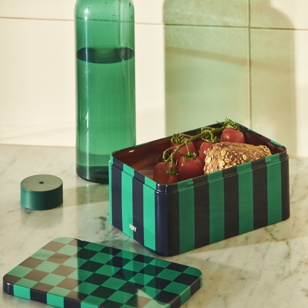 HAY's Tin Containers er en kollektion af funktionelle og dekorative opbevaringskasser med farverige ternede mønstre og en blank finish. Låget og beholderen er justeret i farverne, hvilket skaber et slankt, rent udseende, samtidig med at det sikrer en lufttæt pasform, der er velegnet til opbevaring af tørfødevare. Tin Container fås i et bredt udvalg af størrelser, former og designs og kan placeres dekorativt på hylder eller borde rundt omkring i hjemmet til opbevaring og organisering af forskellige ting.