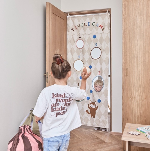 Tivoli Spilledøren bringer klassisk sjov ind i hjemmet med et legende, karneval-inspireret design. Hæng den i en døråbning med stofstropperne – helst på en teleskopstang – og skiftes til at kaste bolde gennem de nummererede huller for at samle point.